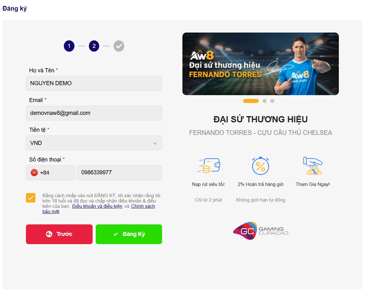 Bấm Đăng ký là thành công tạo tài khoản aw8 rồi đó.