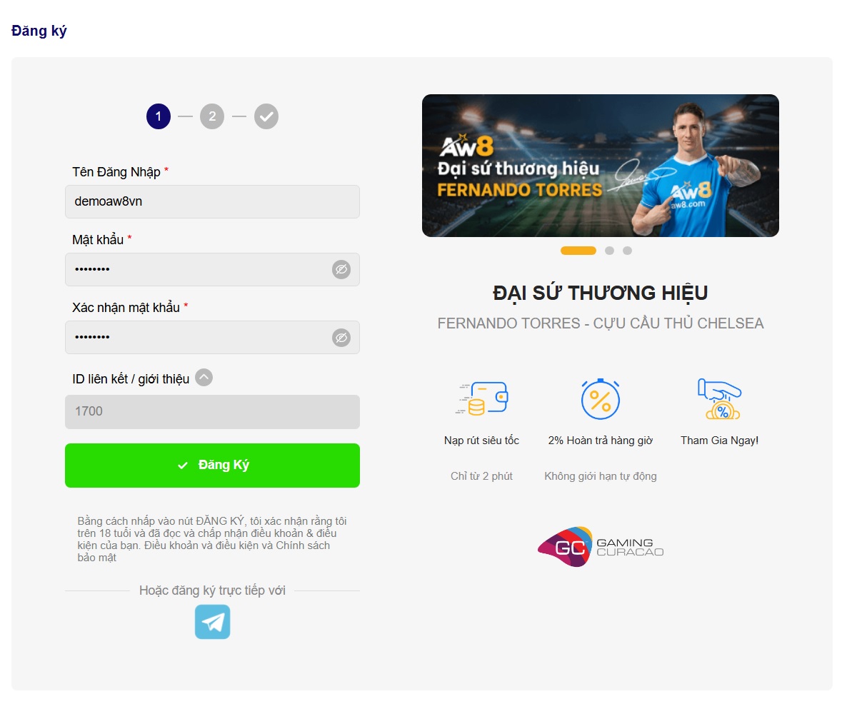 Đăng ký tài khoản AW8 nhanh chóng chỉ vài nốt nhạc.Đầu tiên truy cập vào các đường link aw8 cung cấp trên website, sau đó sẽ hiển thị trang đăng ký tài khoản như sau :